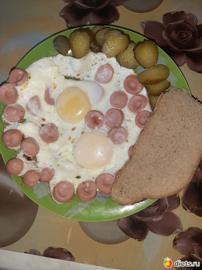 Из за ремонта чуть не пропустила обед, побежала искать чего бы поесть, а у мамы в холодильнике всё то, что мне нельзя при похудении)) в итоге по быстрому поджарила 2 яйца и сосиску+ нарезал супер вкусный соленый огурец и кусочек хлеба( недоела его). 299 ккал вышло на обед