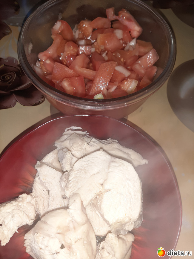 Ну а на ужин сварила по быстрому филе куриное и нарезала салатик из помидорки и лука, заправила ложкой масла. 483 ккал.