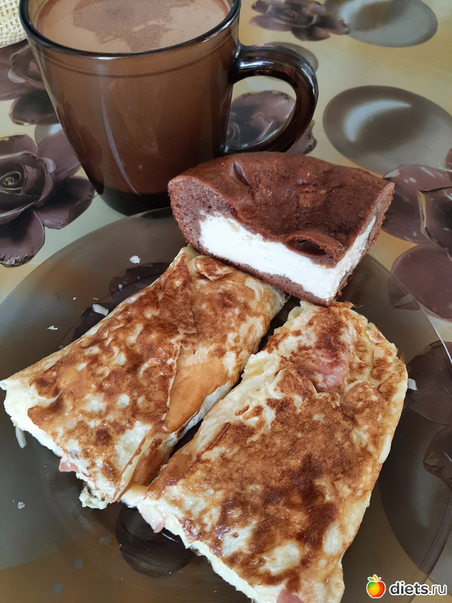 На завтрак японский омлет и кусок маминого творожного пирога+кофе с молоком. Вышло на 505 ккал
