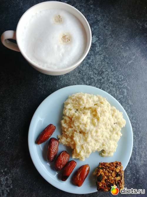 Завтрак: каша пшённая, финики, капучино, батончик мюсли.