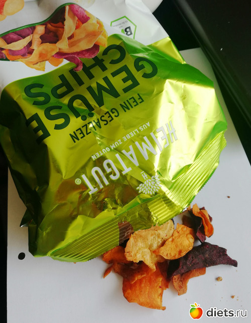 Перекус: овощные чипсы, совсем немного (может грамм 10-15), грамм 10 сухих бананов