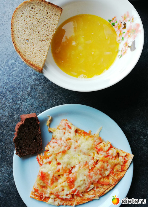 Обед: суп гороховый, ржаной хлеб, пицца из цз лаваша, кусочек пп шоколадного брауни и капучино