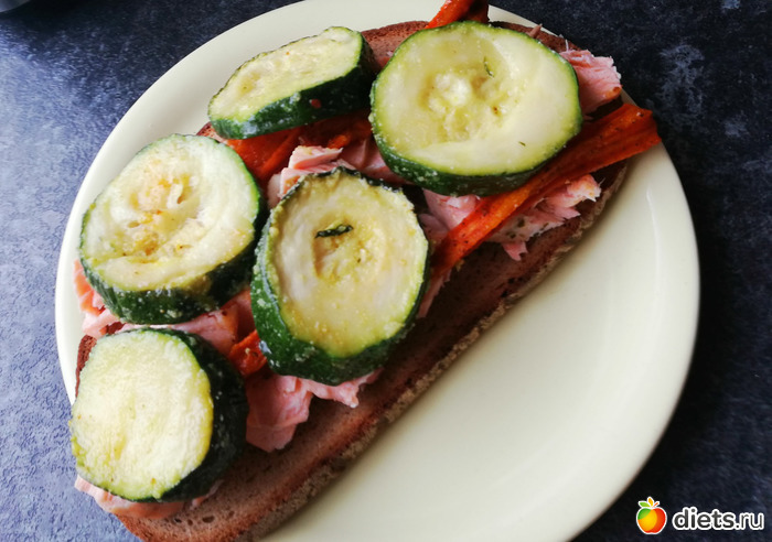 Ужин: бутерброд из ржаного хлеба, запеченого лосося, остатков запеченой моркови и запеченого кабочка