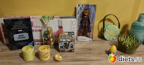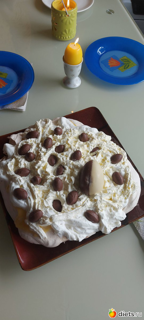 В субботу заканчивали приготовление к празднику - докупили недостающие продукты, убрали и украсили квартиру, и я начала готовку. Было запланировано снова, уже в третий раз, готовить торт по принципу Павловой, и в субботу я заранее иcпекла меренгу и приготовила лимонный курт. Сам торт собирала в воскресенье, непосредственно перед подачей на стол. Украсили его шоколадными яйцами (привет, Аня