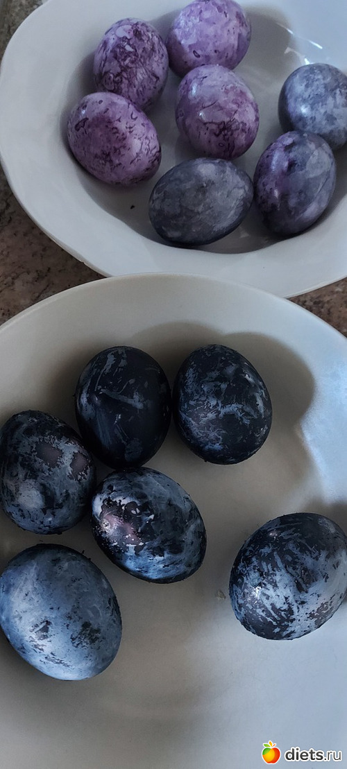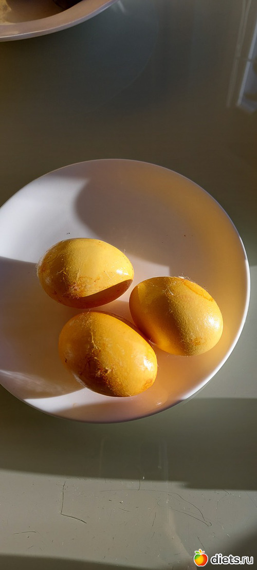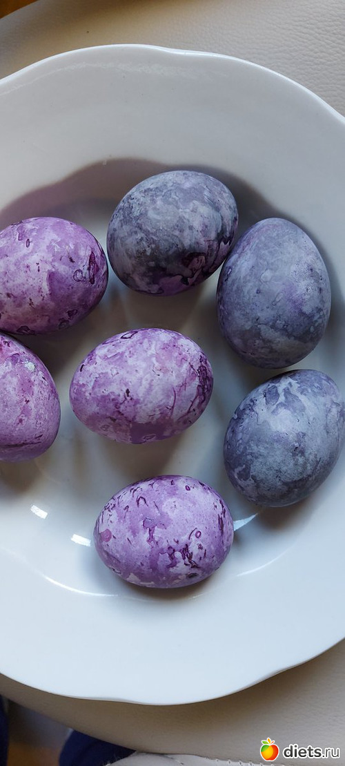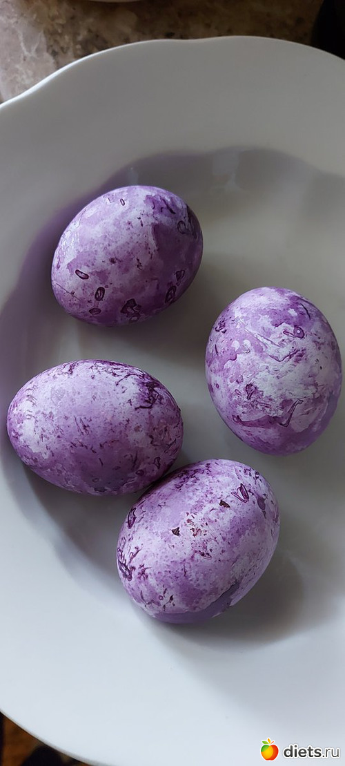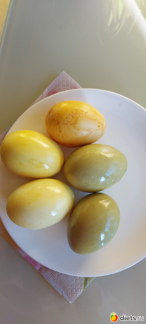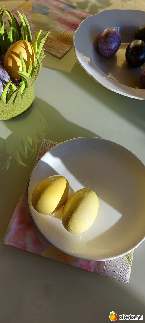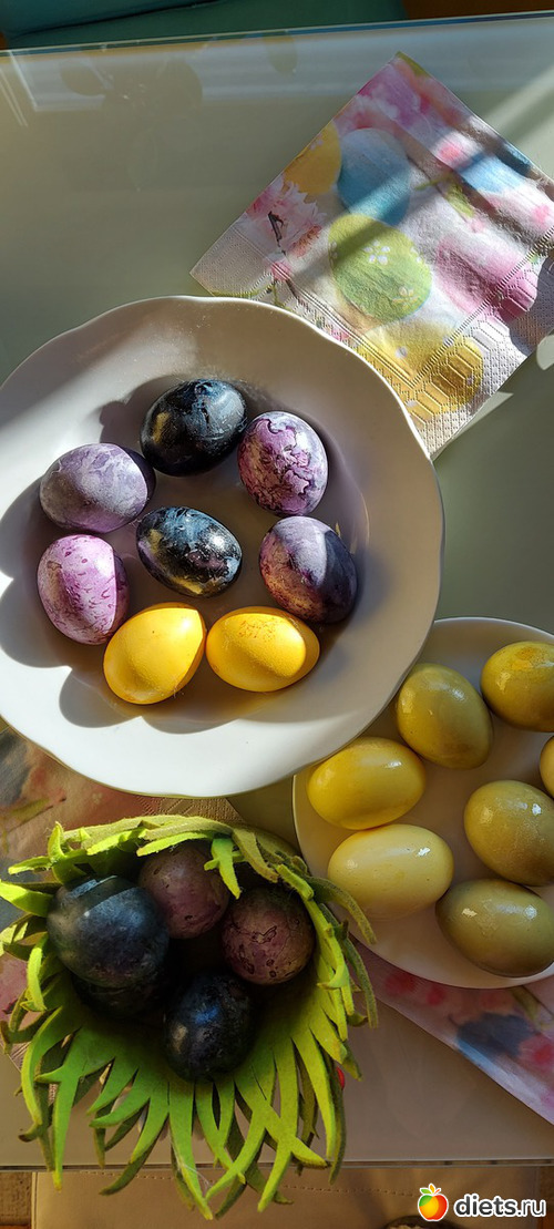 Потом уже были добавлены 2 ст л уксуса 9 % для окраски в желтый и зеленый, но там уже яйца без варки окрашивались (просто подержали в растворе)