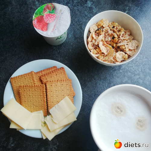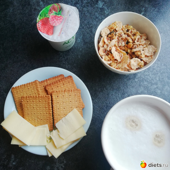 Завтрак: гранола (остатки), йогурт без сахара, печенье цз, сыр и капучино
