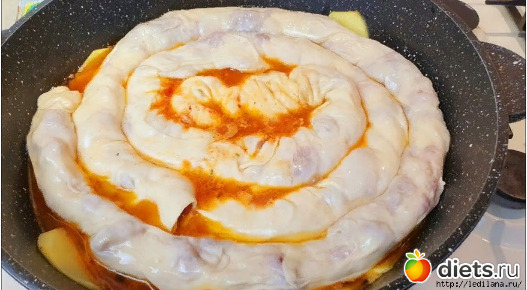 14. Аккуратно свернуть рулет и выложить его поверх картофеля, закручивая спиралью.