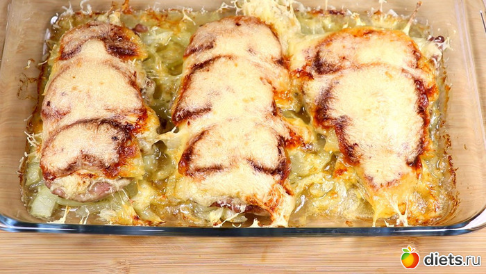 4. Сверху лука выложить мясо и кольца консервированного ананаса.