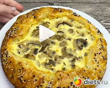 заливку и грибы. Бортики завернуть на пирог, смазать яйцом, посыпать кунжутом.