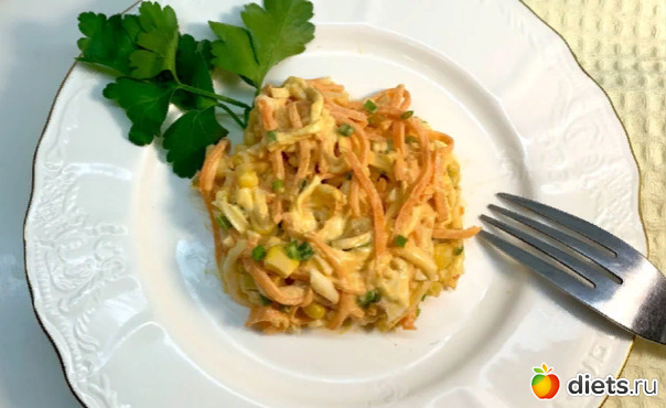 Так же вам понадобится морковь по-корейски–50 грамм. Будет вкуснее если её нарезать на короткие отрезки