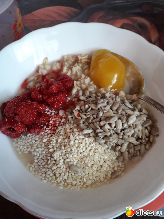 -Геркулесовая каша на воде, с медом, с лесной малиной, семечками, кунжутом
