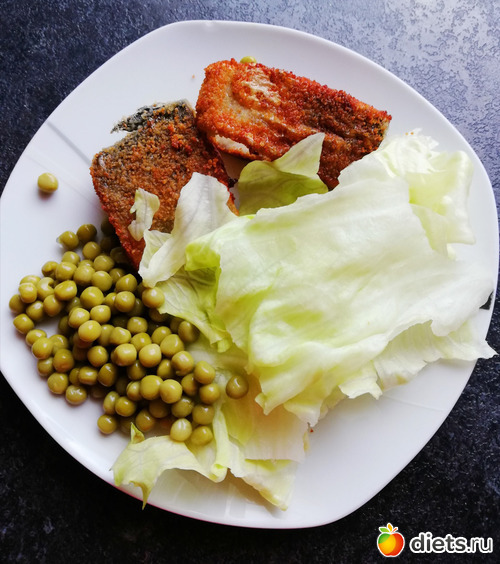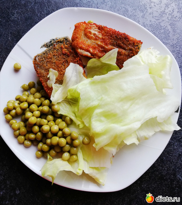 В то время как мои точили на ужин рис с рыбным палочками (от рыбки все отказались, кроме мужа) Я лопала форель в небольшом количестве панировочных сухарей, листья салата и горошек.