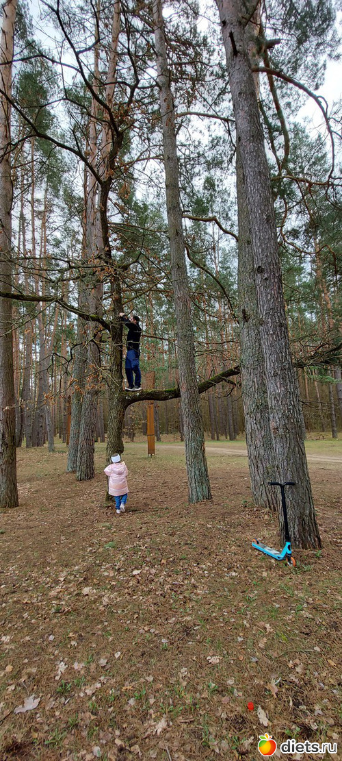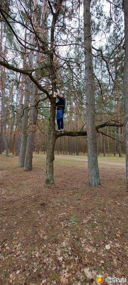 Дети папу загнали на дерево, что б скворечник оказался на нужной высоте (ориентировались по близвесящим