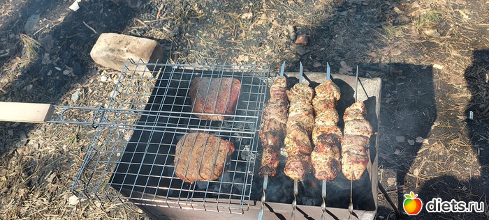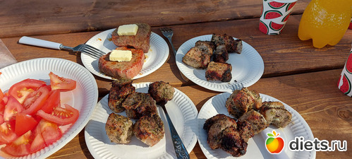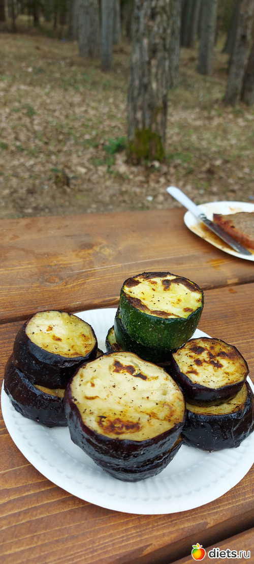 Ну и обедо-ужин: свиной шашлык мне и детям, говяжьи стейки мужу, баклажан и кабачок на гриле всем