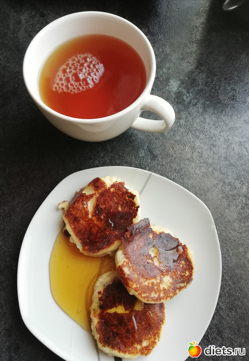 Обед : сырники, мёд и чай.