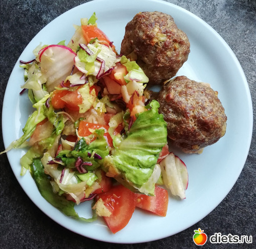 Ужин: две котлетки запечённые, салат и кофе с молоком.