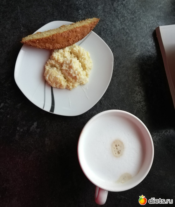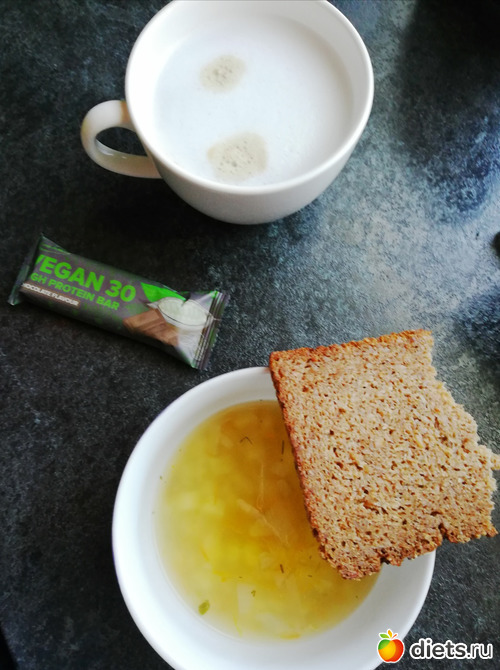 Обед: суп, цз хлеб, капучино и протеиновый батончик