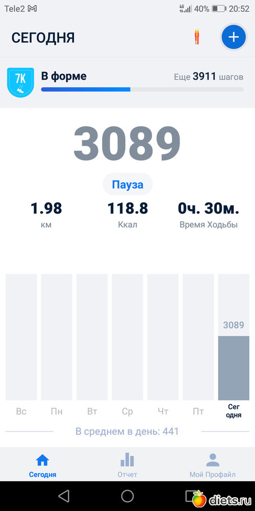 День 1. 3000 шагов. Приложение оказалось каким-то неправильным. Судя по проложенному маршруту на карте прошли километров 7, по времени 1 час 20 мин., а приложение показало всего 3000 шагов и какую-то ерунду с километрами и временем. Ну пусть уже будет так, "первый блин комом"