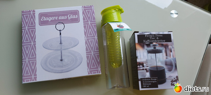 подставка для выпечки, бутылка с контейнером для фруктов/ягод/овощей внутри, фенч-пресс
