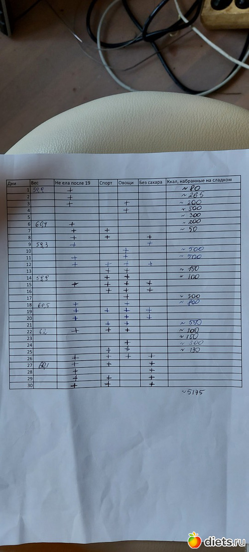). Из сладкого за месяц было немного шоколада, 1 упаковка йогурта (400 г), 1 десерт тофу, 1 холодный кофе, 2 ореховых батончика, сколько-то конфет, профитроли везла, когда ездили к маме. Это примерно. Всего сладким наедено на 5175 ккал, чтo в пересчете на кг составляет меньше 1 кг (1 кг - 7000 ккал). План на следующий месяц - продержаться хотя бы 10 дней без сладкого и по калорийности не наесть сладким больше