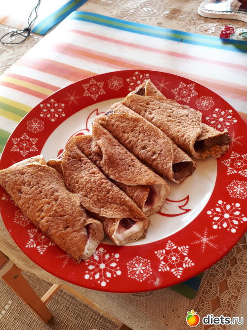 Обед ранний (через час после завтрака): суп с шампиньонами и яичной лапшой по дюкану + шашлык куриный + трубочка из овсяноблина с кремом и малиновым диетическим вареньем. Вот фотка: