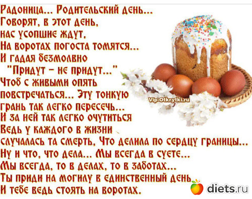 А вторник следующей после Светлой седмицы — это первый день, когда совершается поминовение усопших гласным образом, когда после Литургии совершается еще и панихида. И этот день становится днем общей радости — нашей и наших почивших близких, потому что мы, совершая о них заупокойные молитвы, в то же время призываем их разделить с нами ту радость, которой радуемся в этот пасхальный период. И слово «Радоница» со словом «радость» однокоренное.