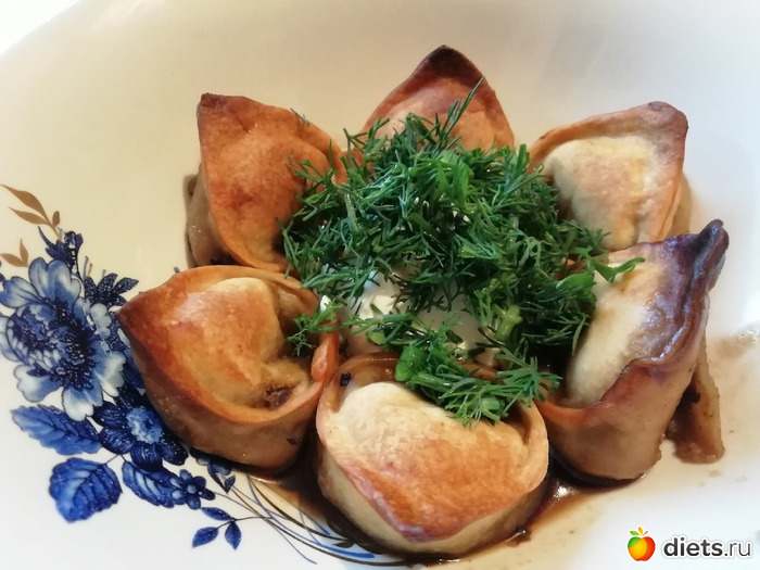 Фишка этих вареников в тесте, в том что предварительно запекаются, а затем тушатся в грибном бульоне. Желательно в горшочках. Но у папы их нет, поэтому в сковородке делала.