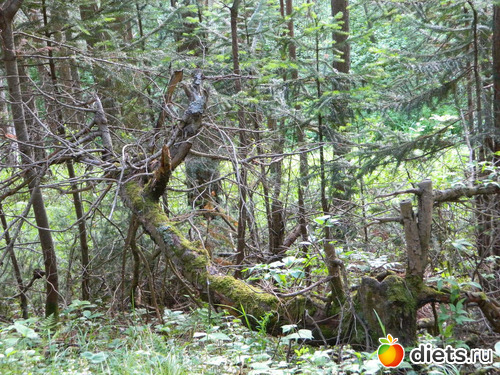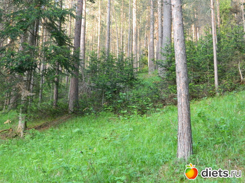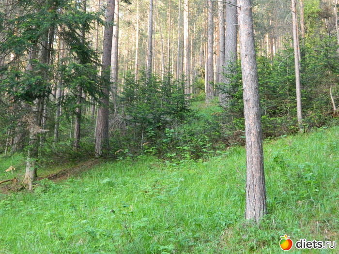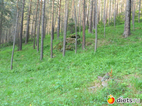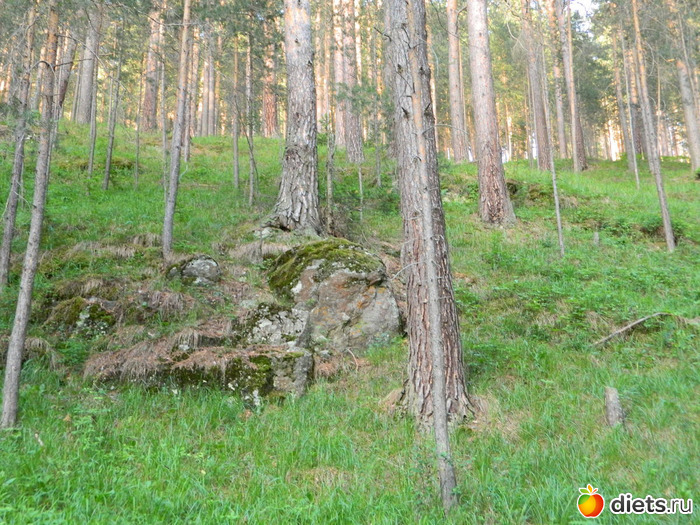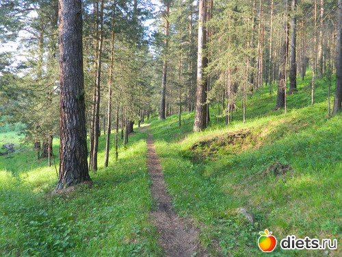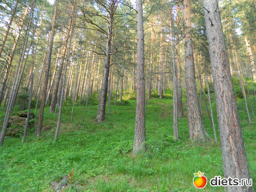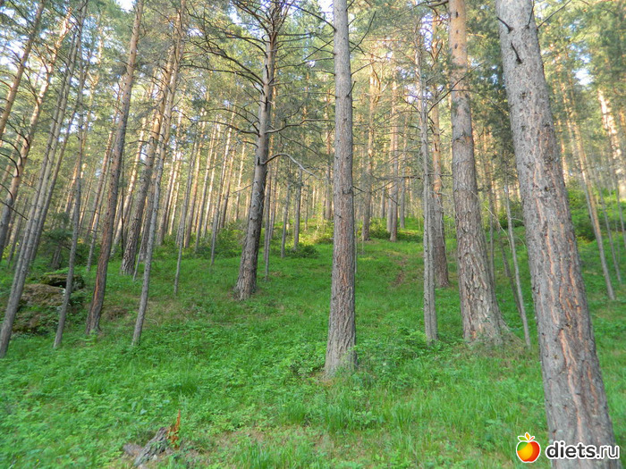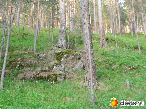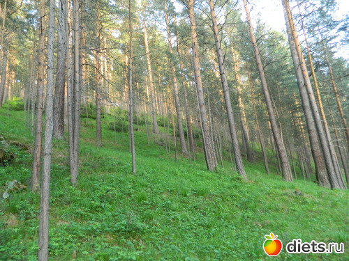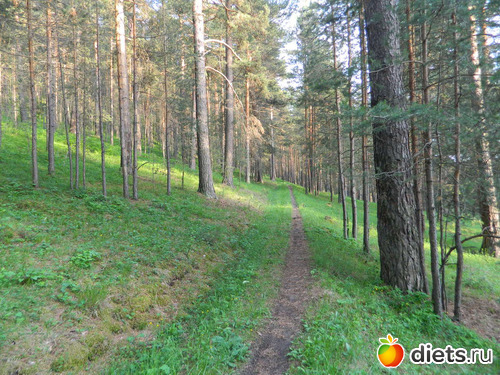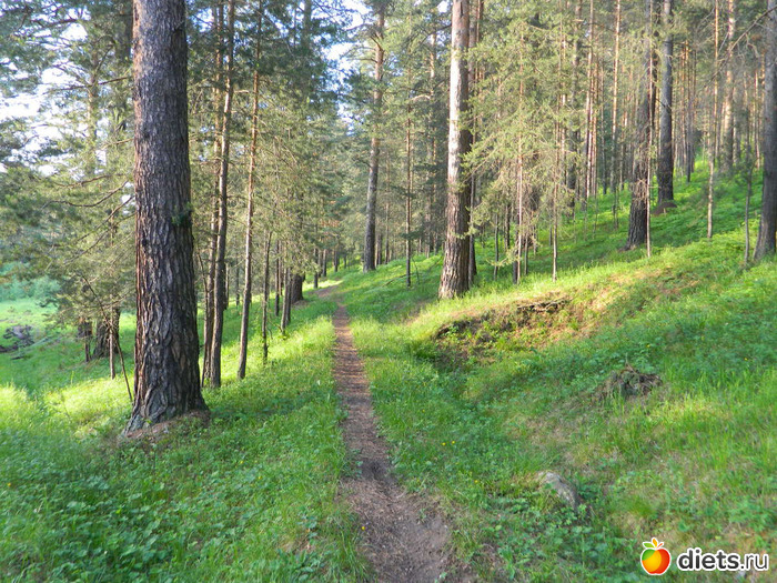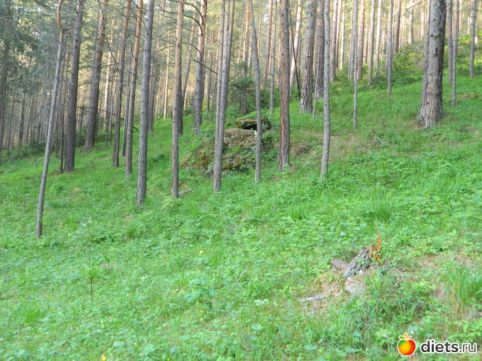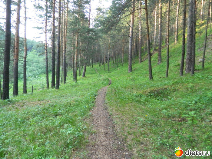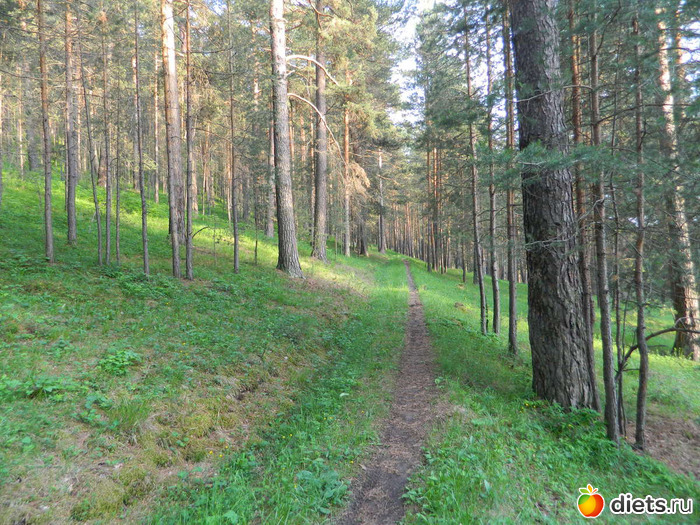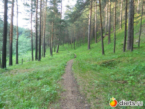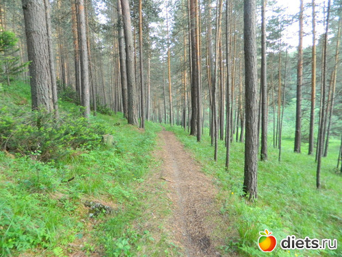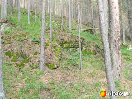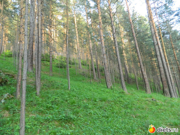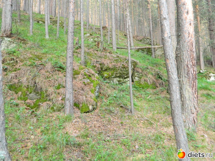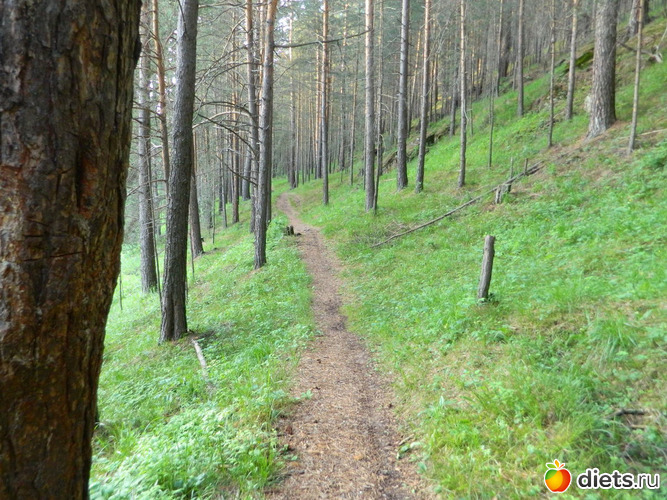 Сначала идёшь по сосновому лесу, потом с одной стороны сосны и гора остаётся,