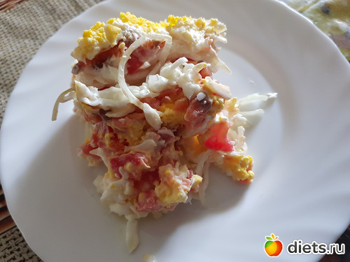 Когда-то, где-то ела подобный салат, но мне не понравилось много сока от помидор и очень резкий и горький вскус репчатого лука, я все это дело исправила...