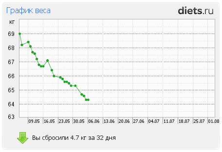 Итак, я начала худеть с 5 мая. Прошел месяц, хочу вот подвести итог. Получается, что за месяц я избавилась от 4,7 кг лишнего веса!