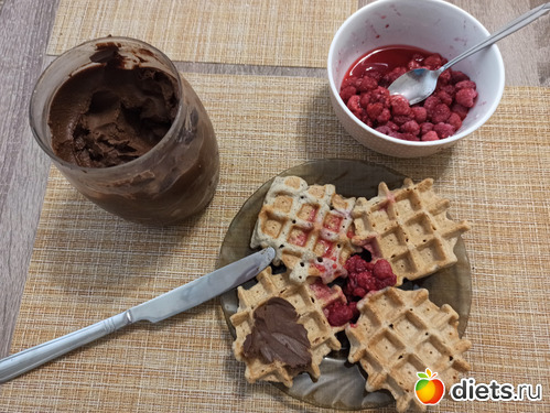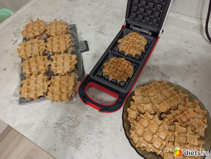 Из этого количества ингридиентов получается очень много вафель, но автор советует какую то часть съесть, а остальное заморозить и потом разогревать в тостере или духовке. Я так и сделала. Можно эти вафли есть со сладким топингом, вареньем, джемом и тд, можно с несладким - с каким нибудь паштетом или икрой. Если нет вафельницы, то можно пожарить как блинчики.