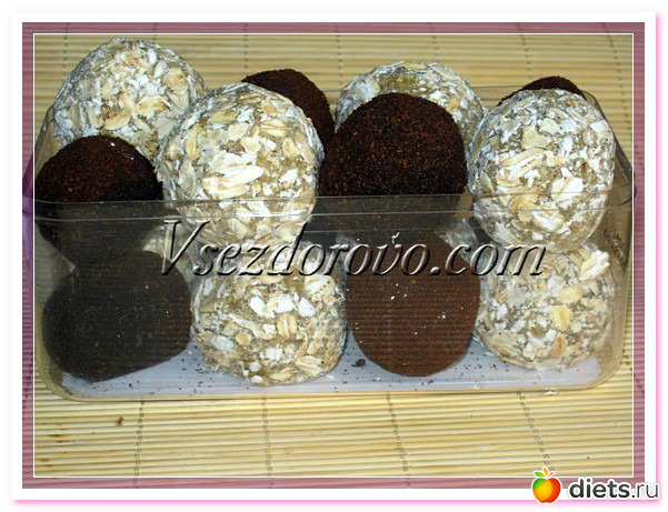 Добавляем вторую часть перемолотых овсяных хлопьев и немного ждем. Когда масса начнет густеть, тогда руками формируем из нее небольшие шарики