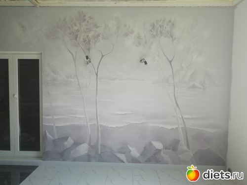И вот, я там уже третий месяц. Там- это домик-коттедж. Я подготовила стены, покрасила и расписала. Сейчас занимаюсь их вторым этажом. Прекрасные милые люди, больше чем заказчики. Всё потихоньку продвигается. Им так понравилась роспись на первом этаже, что мы планируем расписать еще две зоны. Покажу что получилось, если найдутся желающие посмотреть.