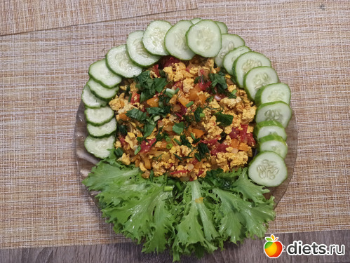 1. Лук мелко порезать и обжарить на сковороде. Добавить мелко нарезанный персик и немного ещё обжарить. Тофу покрошить руками в сковороду, добавить немного водички (пару ст л), соль, специи, хорошо перемешать и немного потушить. В конце добавить порезанные помидоры и тушить до мягкости овощей. В тарелке посыпать зеленью.