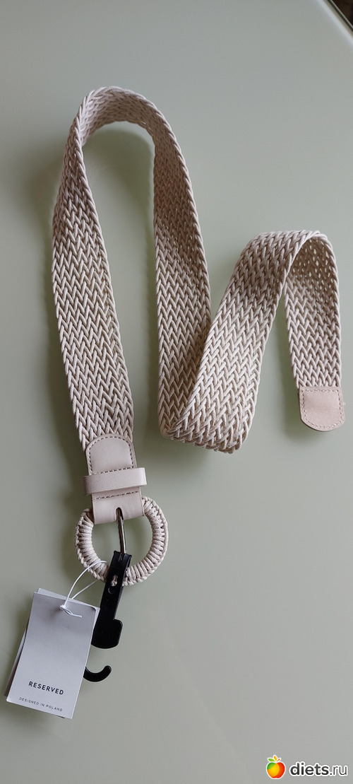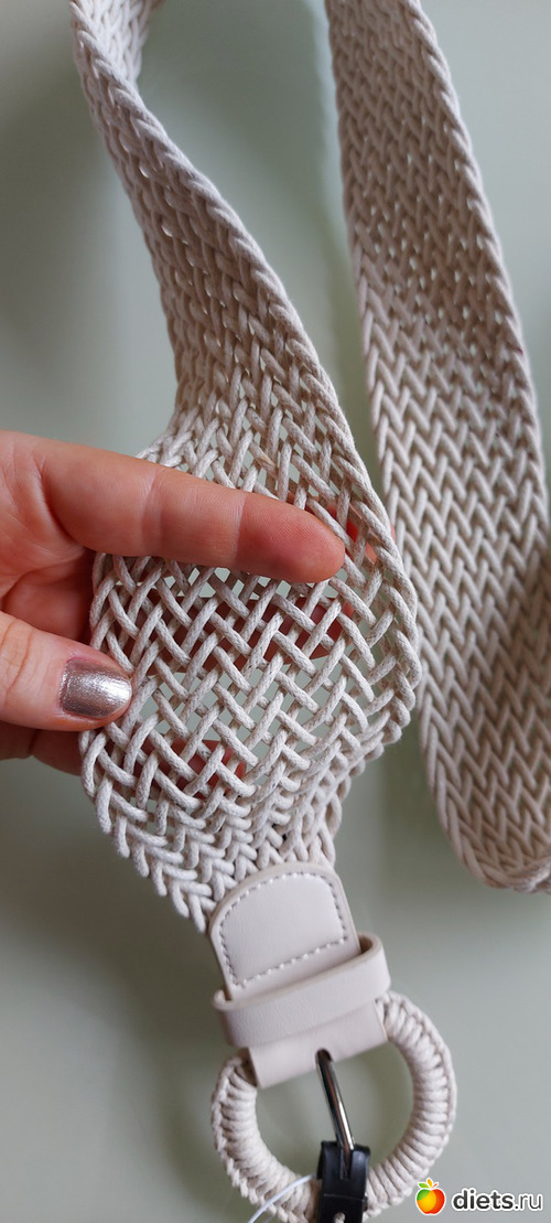 Ремень молочного цвета. Понравилось необычное плетение. Специально сделанных дырок в нем нет - можно в любом месте продеть язычок