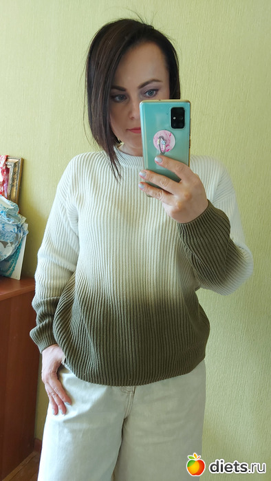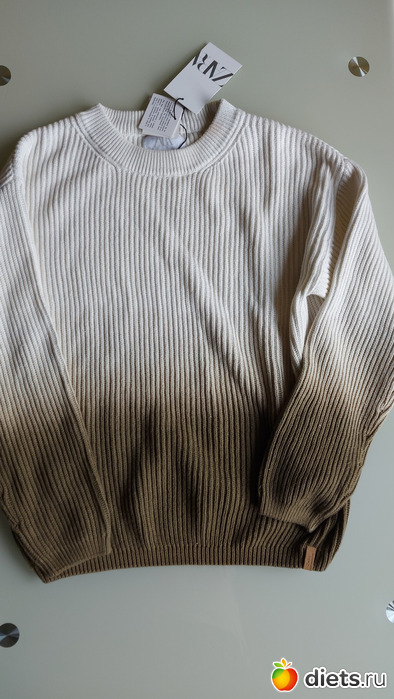 Хлопковый свитер с градиентом. Причем если б я его заказывала онлайн, взяла б размер 164 (у меня рост 160) и пошел бы он на возврат.. Хорошо, что представилась возможность примерить его вживую, в 164 утопла, стала мерять размерчики поменьше и остановилась в итоге на 140
