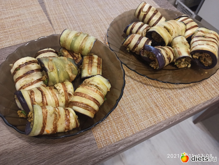 Дальше баклажаны по идее надо пожарить на масле. Но я сейчас не готовлю с маслами, поэтому я их без масла загрилила в электрогриле. Ореховую пасту выложить на лепестки баклажана и завернуть рулетиками. Очень это дело я люблю