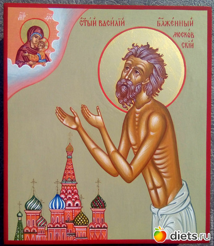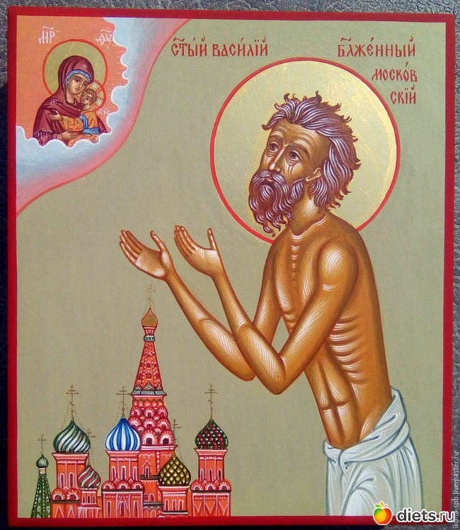 В описании облика святого сохранились характерные подробности: "наг весь, в руке посошок". Почитание блаженного Василия всегда было настолько сильным, что Троицкий храм и пристроенная Покровская церковь и доныне именуются храмом Василия Блаженного.