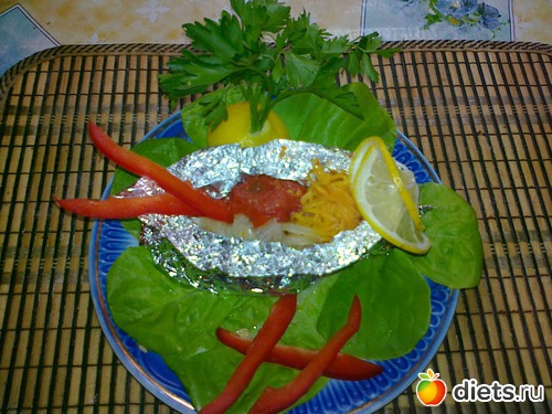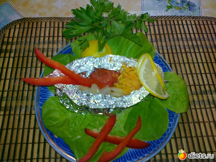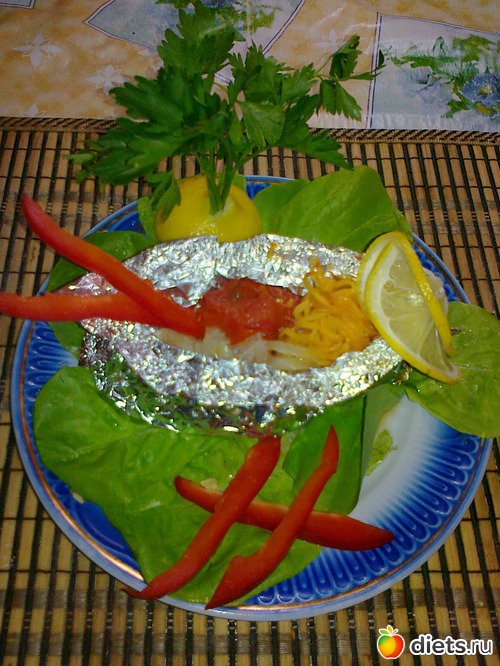 Сначала кружочек лимона, следом зелень, потом лук, помидоры, морковь, рыба, лук, морковь, помидоры. Рыба должна оказаться посередине.