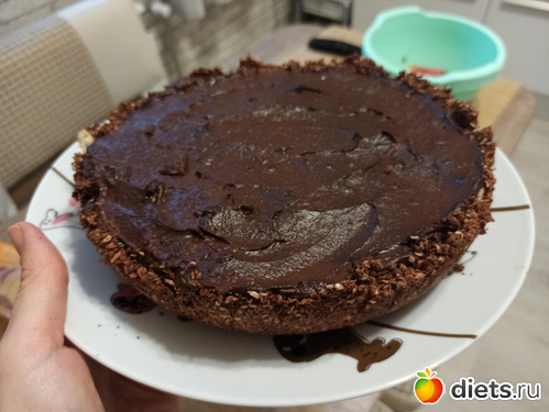 Я опять же добавляла кокосовое молоко, тк слишком густой крем выходит, и какао уменьшила до 40 гр, и это уже дофига шоколадно. В общем, в блендере всё взбить до однородности и выложить сверху. Торт поставить на ночь в холодильник застывать. Вот что получилось у меня: