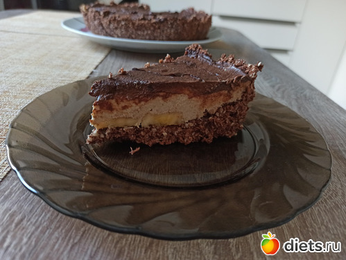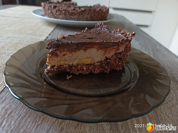 Банан порезать кружочками и выложить на основу. Остальные ингредиенты сложить в чашу блендера и взбить до однородности. Я ещё в крем кокосового молока на глаз добавила, тк слишком густой получился. Крем выложить поверх бананов.