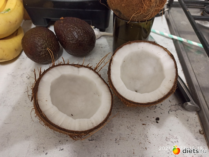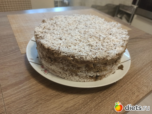 . Бананы взбить в блендере с кокосовой водой. Чернослив (предварительно замочить в воде на несколько часов) порезать на кусочки, орехи измельчить в блендере. Далее, выкладываем на блюдо слоями - кокос, чернослив, кокос, грецкий орех, кокос и тд. Слои промазываем кремом из бананов. Убираем на ночь в холодильник настаиваться. Вот что вышло: