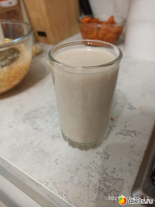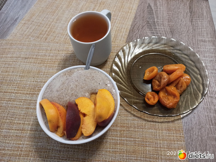 Льняной жмых пошёл на кашу+ туда добавила банан + грушу и взбила блендером, сверху порезала персик