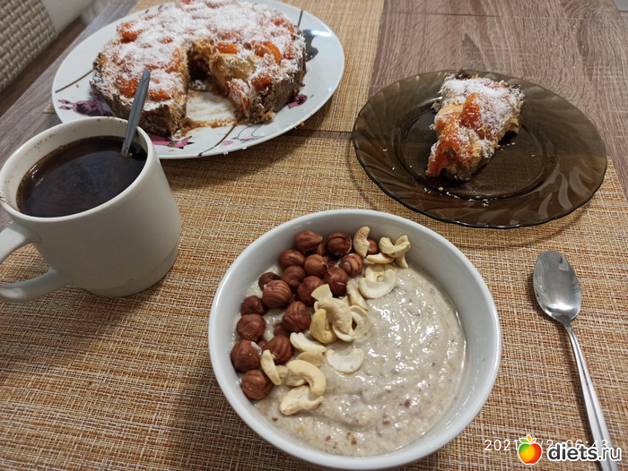 Зелёная гречка с бананом и грушами, туда же запихнула 1 ст л семян льна + орешки, абрикосовый пирог