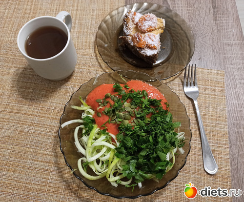 , поэтому в сочетании с кабачком вкуснота. Такие спагетти делают либо сыроеды, либо те, кто на какой нибудь кето, только последние их жарят с фаршем, больше я ни у кого не встречала. На десерт - отвар всяких трав и всё тот же пирог (OMG, прикиньте, мы с мужем за день сточили на двоих целый пирог, который почти полностью состоит из орехов и соответственно, 100500 калорий