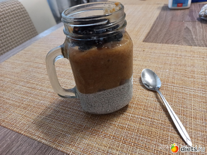 Чиа пудинг (чего я туда только не напихала для сытности), raw халва на сладкое и кофе.