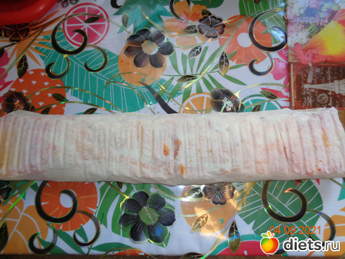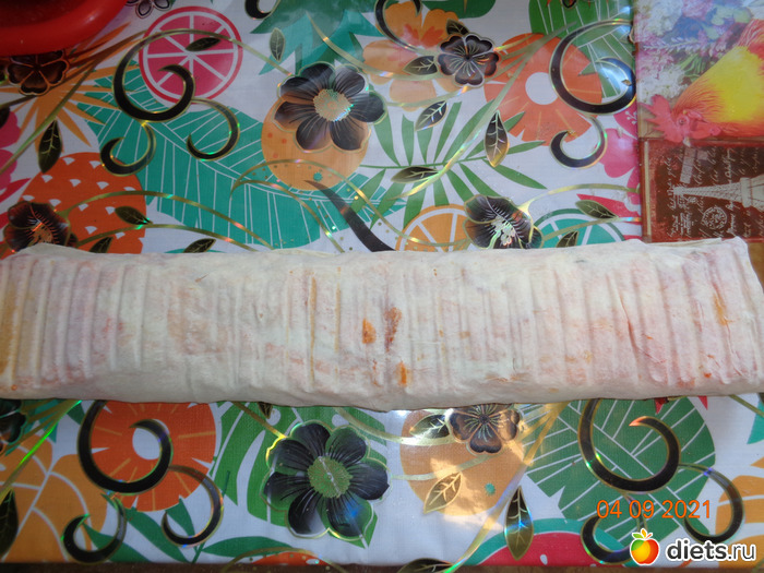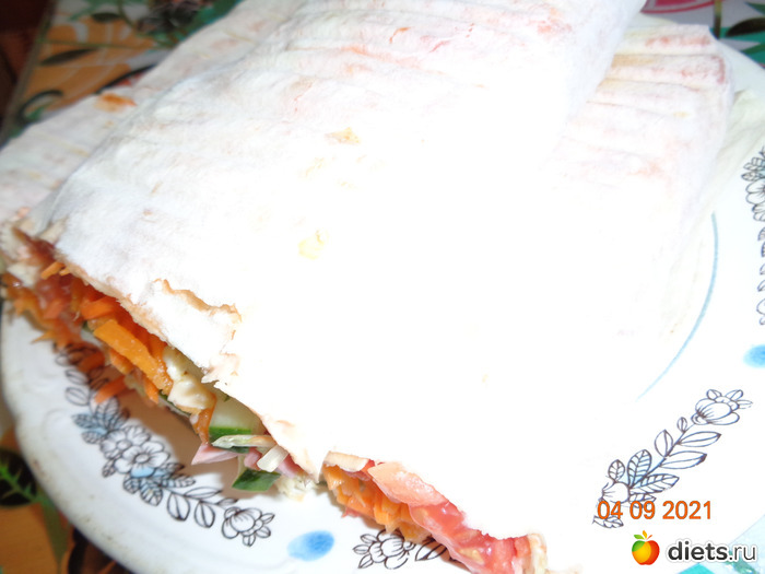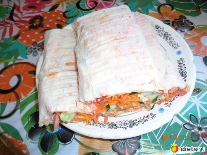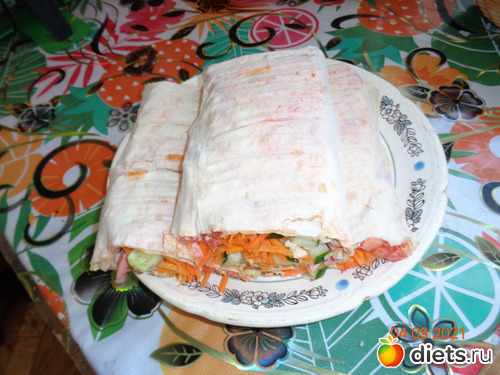 3. Приготовьте шаурму. Разложите лист лаваша. Промажьте его соусом из майонеза и кетчупа. Условно разделите лаваш пополам. На левую половину положите колбасу, помидоры, огурцы, морковь по-корейски, капусту и сыр. Загните края лаваша сверху и снизу, чтобы начинка не вываливалась. Сверните лаваш в плотный рулет. Положите шаурму на сухую сковороду и подсушите с обеих сторон на среднем огне.