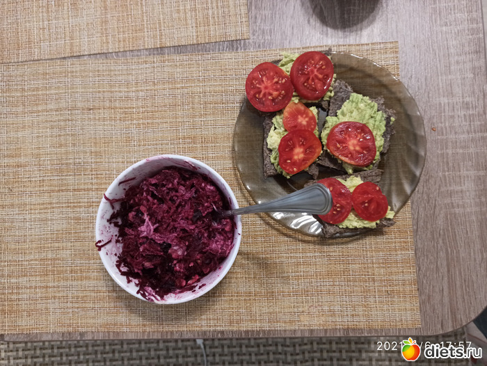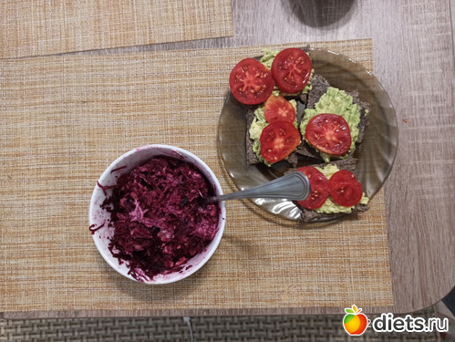 На ужин у меня салат из свеклы, чернослива, чеснока и орехов с raw майонезом, бутеры с авокадо и томатом.
