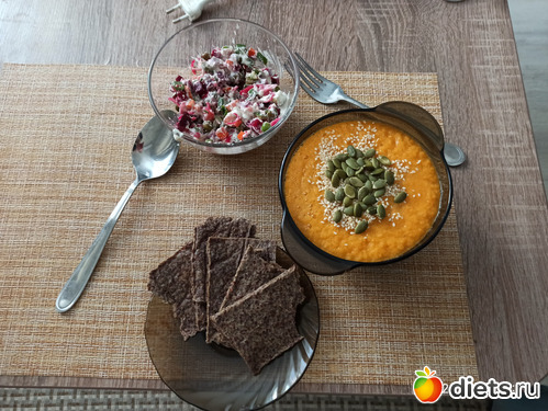 У меня суп пюре из кабачка, винегрет, сыроедные хлебцы, а на сладкое - пастила, мёд и травяной чай