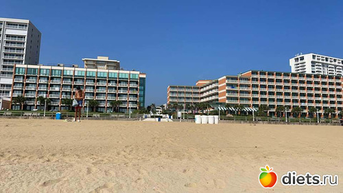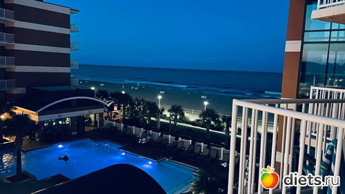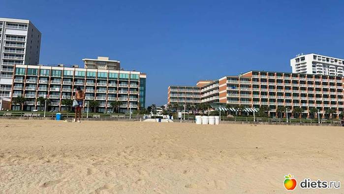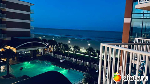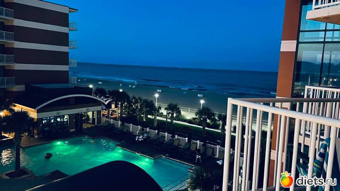Еще мы перед школой съездили отдохнуть в соседний штат на пляж. Вот такой вид на отель с пляжа